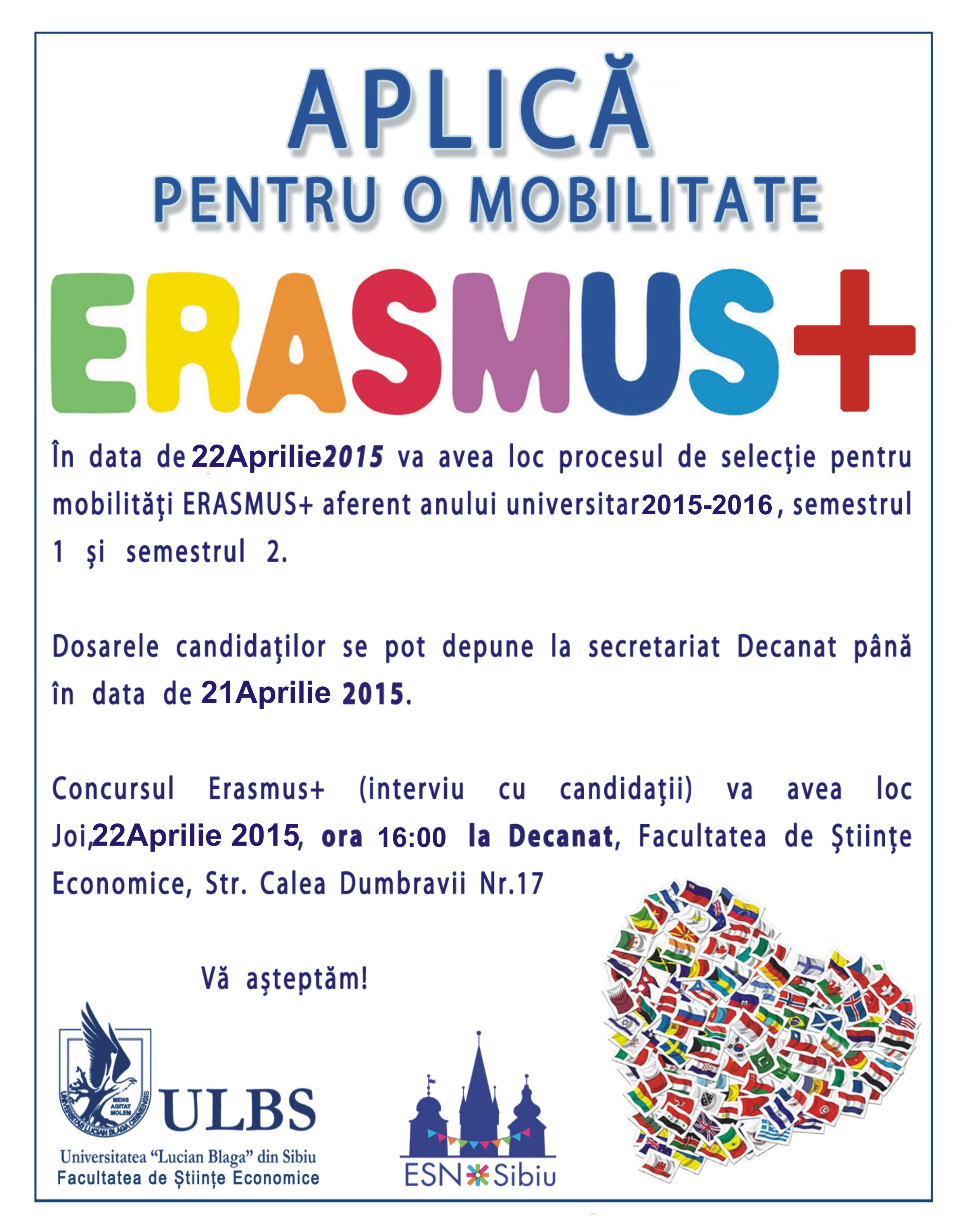 În data de 22 Aprilie 2015 va avea loc procesul de selecție pentru mobilități ERASMUS+ aferent anului universitar 2015-2016, semestrul 1 și semestrul 2.